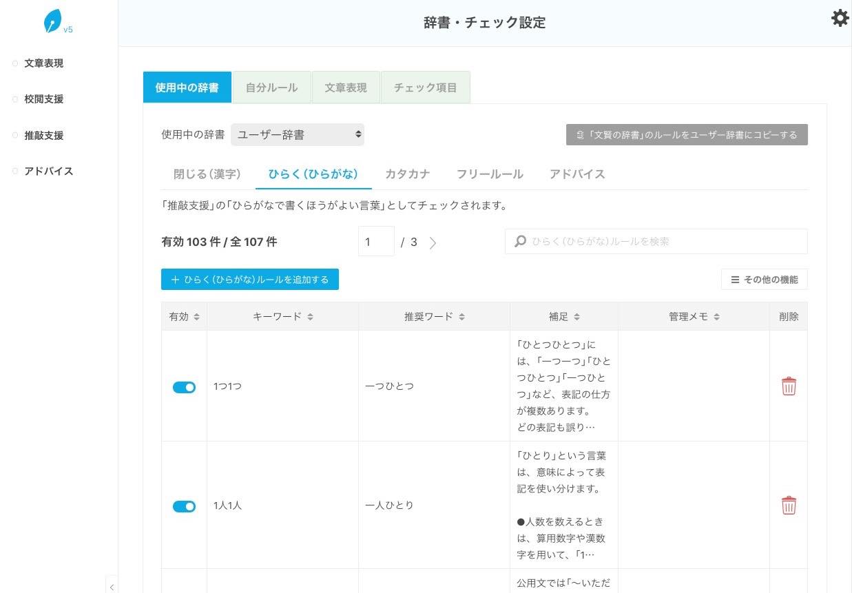 漢字のひらき・閉じや、ひらがな・カタカナ表記の使い分けなどは、個人や会社によって独自ルールを作っているケースも多いので、この機能は必須とも言えますね。