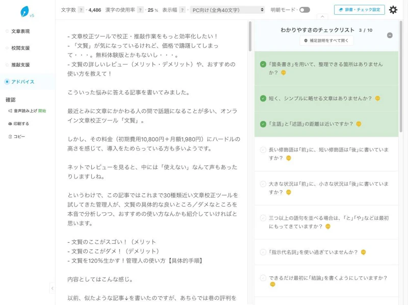 他の文章校正ツールと比較して文賢が優れているのは、以下の3点だと僕は思います。