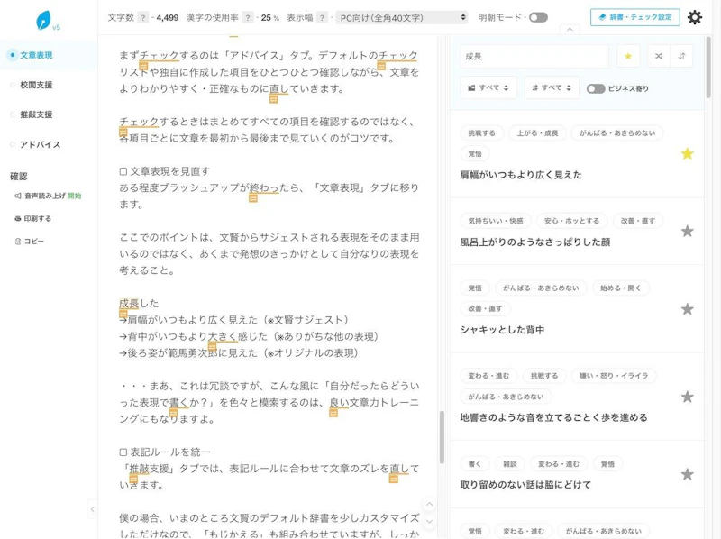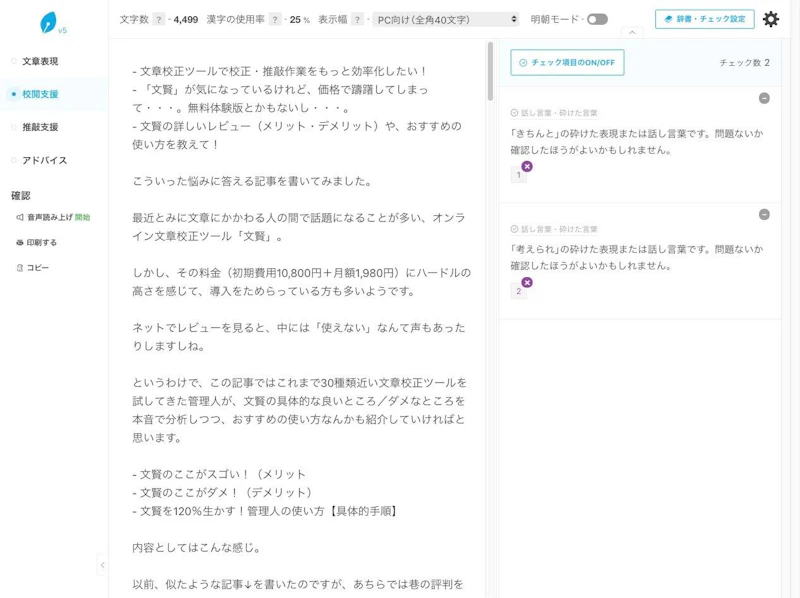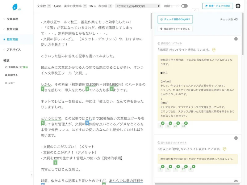 まず前提として、文賢は表面的な誤字脱字や表記ミスを直すだけ「校正ツール」でなく、内容を含めた文章全体をブラッシュアップさせるための「推敲ツール」として考えるようにしましょう。