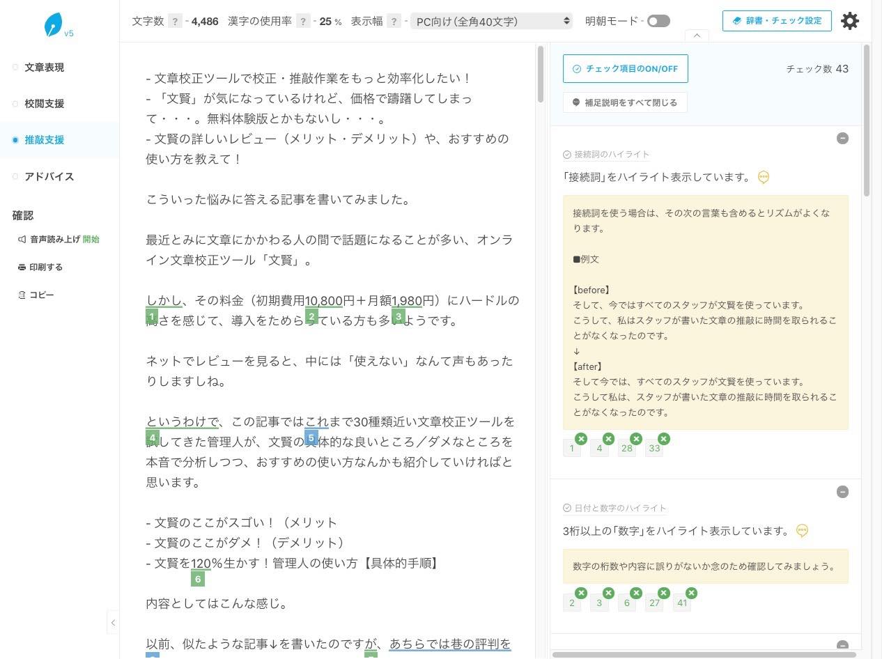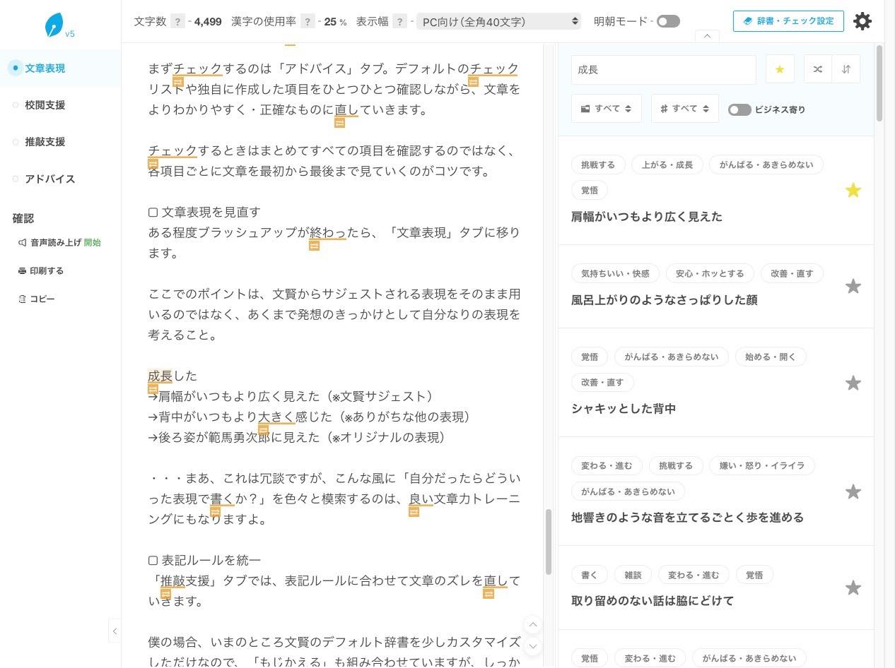 文賢を利用していると、(文章力が上がってきたおかげか)指摘される回数が目に見えて減ってくるのを実感できます。
