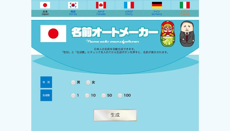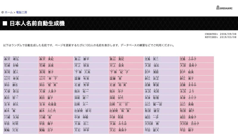 サイトにアクセスするだけでランダムな日本人の名前を100個自動生成してくれるツール。