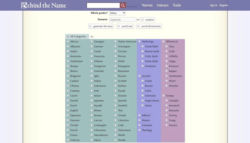 様々な国の膨大な量の男性・女性名がまとめられたサイト。