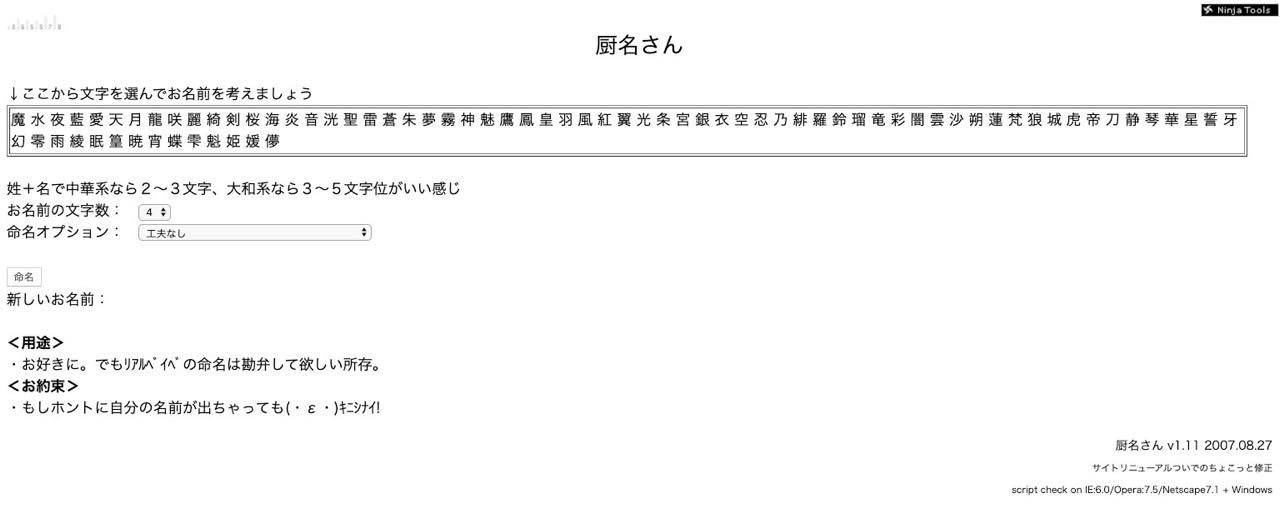 その名の通り、厨名(中二病っぽい名前)が作成できるジェネレーター。