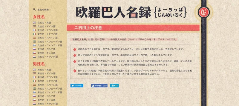 プロの研究家顔負けの詳細な名前データがまとめられたサイト。