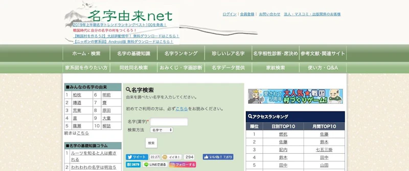 名字の由来や使用ランキングなどが調べられるサイト。