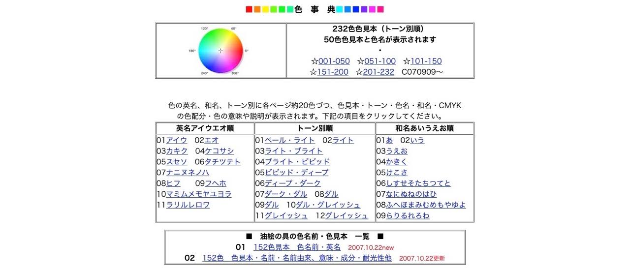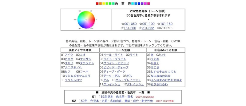 色の和名・英名や見本などが一覧できるサイト。