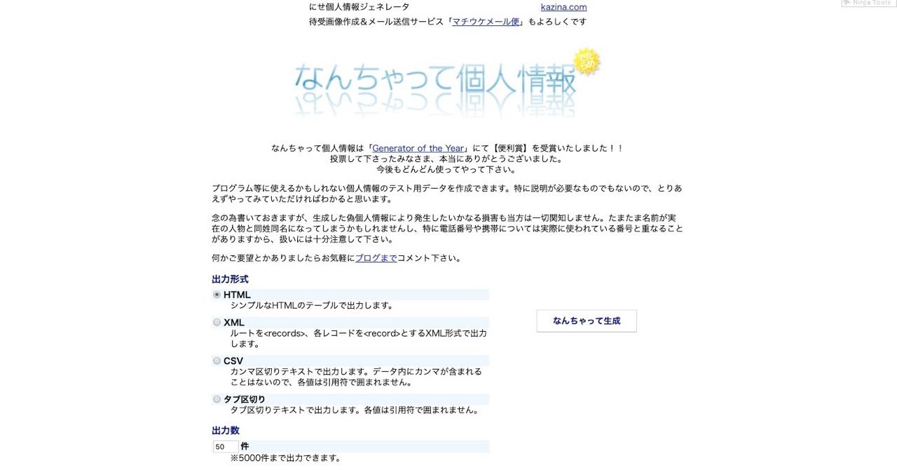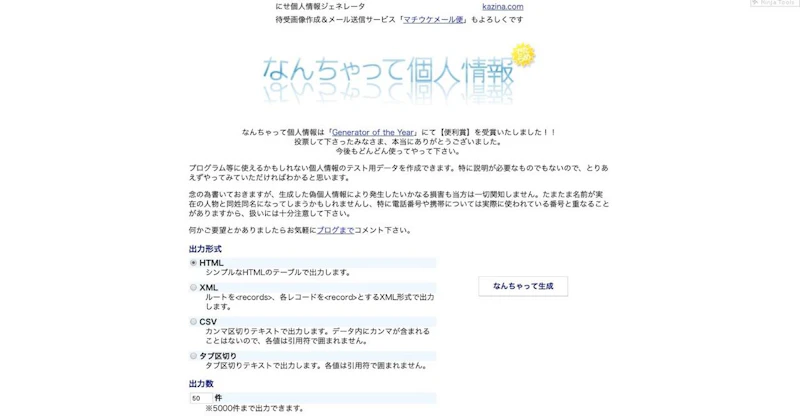 名前だけでなく、年齢や誕生日、血液型や電話番号まで自動生成できちゃうジェネレーター。