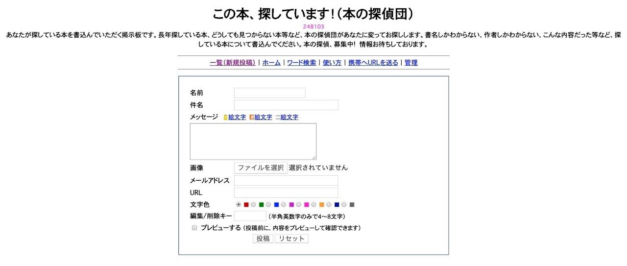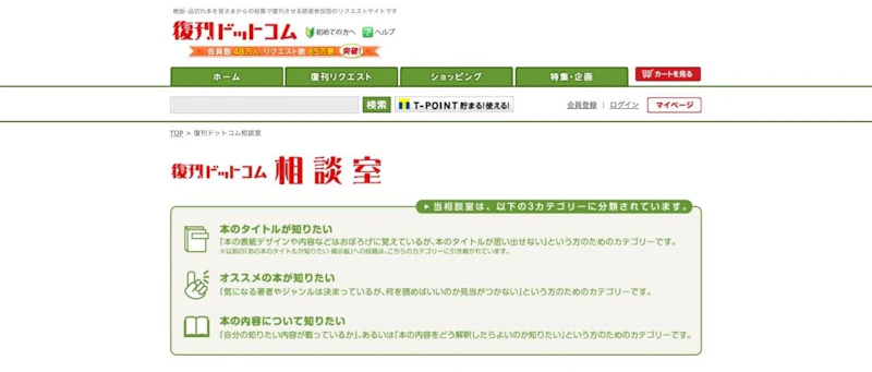 絶版・品切れ本の復刊をリクエストできるサイトですが、専用の相談室(掲示板)で、タイトルが思い出せない本を質問することもできます。
