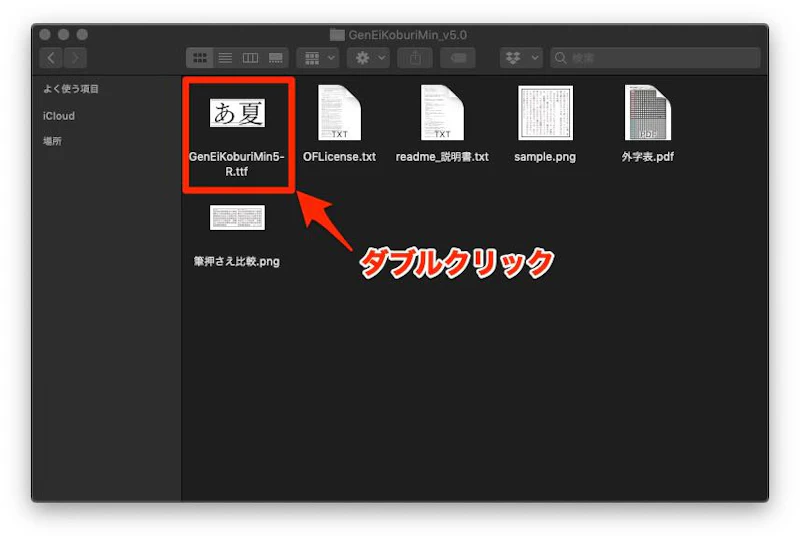 解凍したフォルダの中にあるフォントファイル(.ttf、.otfなど)をダブルクリックすると、プレビュー画面が開きます。