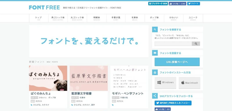 無料で使える日本語のフリーフォントの投稿サイト。変わったデザインのフォントも多く、見ているだけで楽しいですよ。