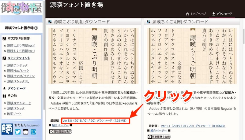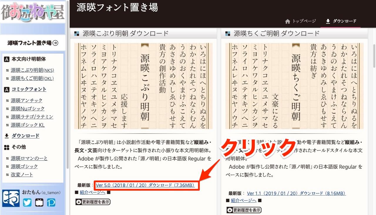 フリーフォントを配布しているサイト(※上記は「源暎こぶり明朝」)から、使用したいフォントをダウンロードします。