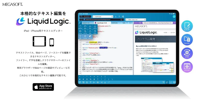 今年5月末にリリースされたばかりのiPhone・iPad用のテキストエディター。Webテキスト(html)の編集に特に優れており、プレビュー用のブラウザやFTPなどの機能も備えています。正規表現検索やgrep検索に対応しているのもポイントです。ソースコードを直接編集しながら記事を書きたいブロガーなどにぴったりのエディターと言えますね。LiquidLogic(iPhone)