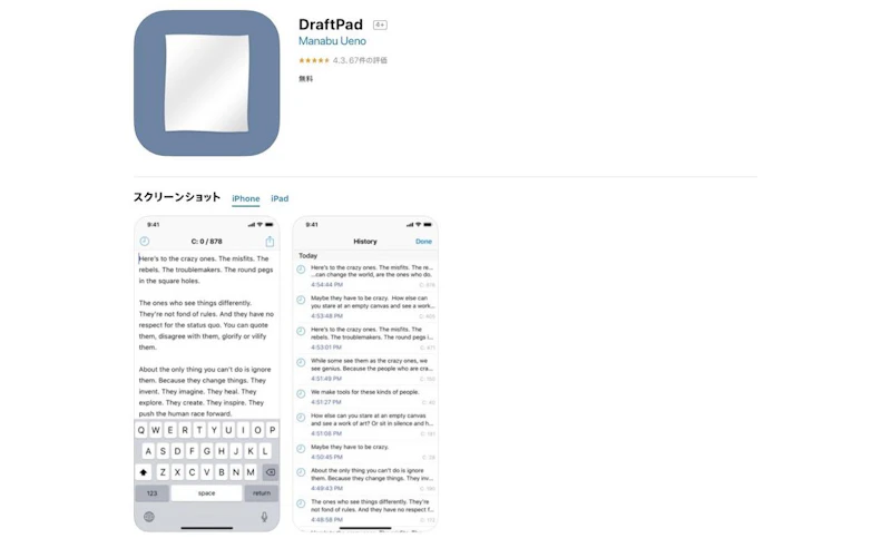 iPhoneでシンプルなテキストエディタを探しているならこちらがおすすめ。変更履歴が自動保存されるので、手軽に以前の文章を確認することができるのが非常に便利です。他のアプリにテキストを送ることもできるので、基本的な文章作成はこのアプリで済ませて、細かな編集はほかのエディタで行うといった使い方もおすすめです。DraftPad(iPhone)