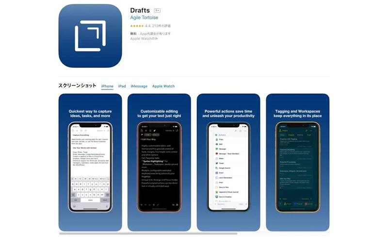Markdownにも対応した多機能テキストエディタ。以前は有料アプリだったのですが、いつの間にか無料化していました。シンプルなエディタ画面ながらも、必要な機能をまんべんなく備えているのが特徴。音声入力もできちゃいます。Apple Watchアプリもあるので、外出先で手軽に音声メモなんて使い方も良さそうですね。Drafts(iPhone)