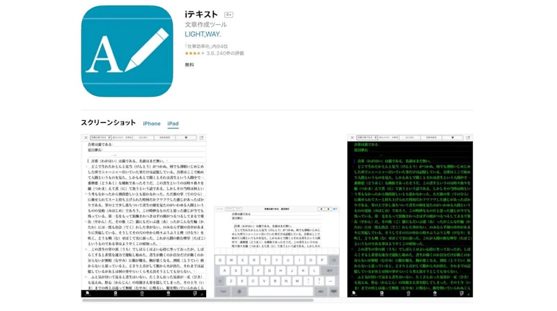 こちらも↑と同じ開発元による無料テキストアプリ。iテキストとの違いは、25万項目の日本語辞書を搭載しているというところ。その代わりに編集できるテキストが一つだけだったり、クラウドサービスの保存・読み込みが制限されていたりします。iテキストと連携して、編集中の文章をこちらで入力するように切り替えたりもできるので、どちらも両方ダウンロードしておくことをおすすめします。iライターズLite(iPhone)