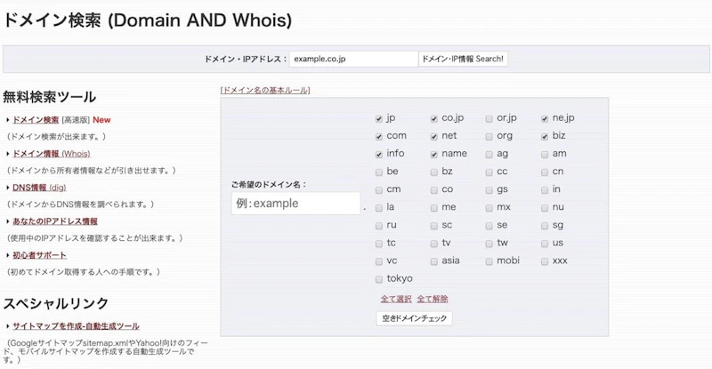以前紹介した『Namechk』でもいいのですが、.jpや.co.jpを調べたい方はこちらの国産ツールがおすすめです。