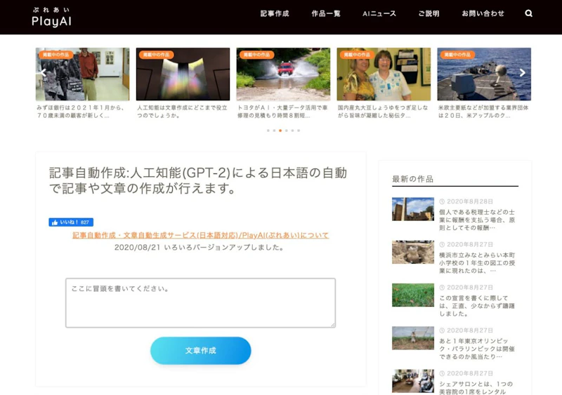 PlayAIは、↑の記事でも紹介した文章自動生成AI『GPT-2』を、誰でも手軽に試すことができるサービスとのこと。