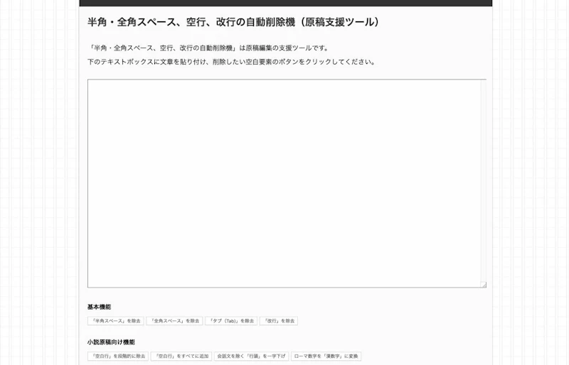 改行や空白行、スペース・タブなどを削除して文字を詰めてくれるツール。正確な文字数を測定したいときや、ネット小説を電子書籍化するときなどに役立ちそうです。半角・全角スペース、空行、改行の自動削除機(原稿支援ツール)