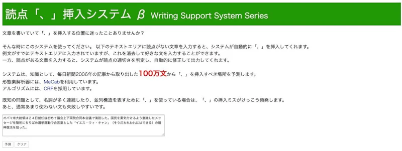 なんと、自動で文章に読点(、)を挿入してくれるという驚きのツール。すでに読点が付いている文章を入れると、システムが修正も行ってくれるすぐれもの。毎日新聞の100万字からなるデータベースを元にしているということで、これで挿入ミスが発生しない文章はクセがない文章という基準にもなりそうですね。読点「、」挿入システム