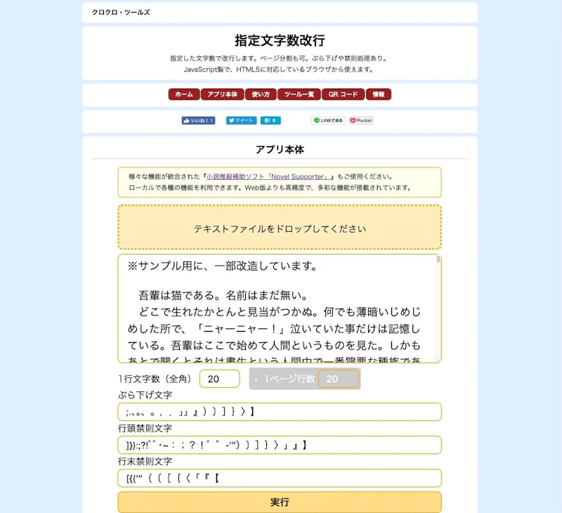 あらかじめ指定した文字数で文章を改行・整形してくれるツール。ぶら下がりや禁則文字などの処理も自動で行ってくれます。メールや投稿小説などの見栄え確認などに使えますね。指定文字数改行