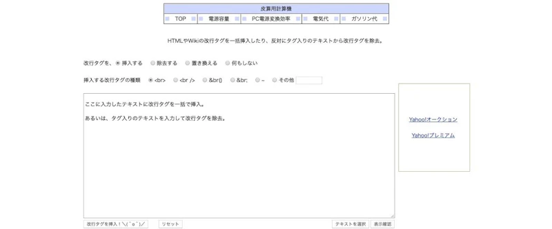 ブロガーに便利な改行タグを自動挿入してくれるツール。HTMLの改行タグ(br)だけでなく、wiki構文の改行タグ(&br()、&br;)の挿入ができるのもポイント。逆に、文章から上記タグを削除することも可能です。HTMLやWikiの改行タグ自動挿入機
