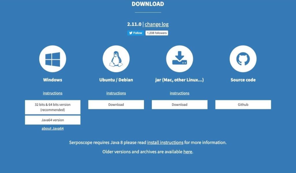 Javaのバージョン確認ができたら、Serposcopeのサイトからインストーラーをダウンロードしましょう。