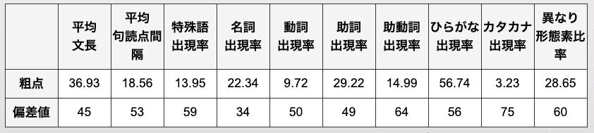 平均文長と名詞出現率の偏差値が低い感じですね。