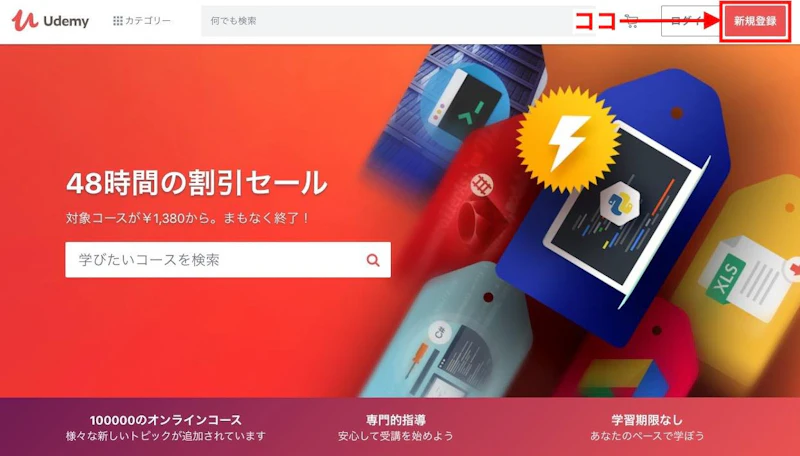 Udemyトップページ右上の「新規登録」をクリック。