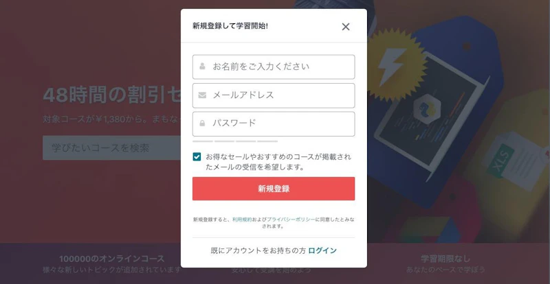 実は、Udemyでは、新規登録者向けに(セール時期以外のどのタイミングでも)割引価格で動画が購入できるキャンペーンが開催されています。