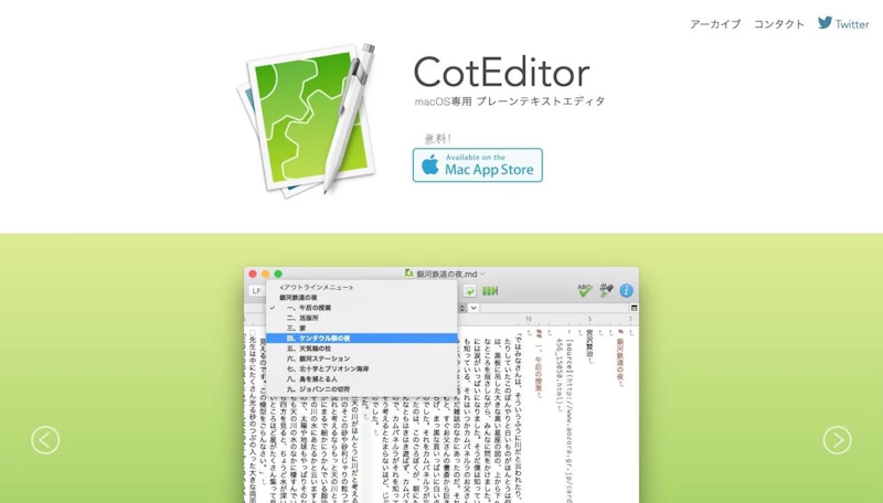 miと双璧をなすフリーのエディタ。僕はこちらを基本のテキストエディタとして使っています。プレーンテキストエディタとは思えないほど機能が充実しており、アウトラインや分割表示などは長文入力にも非常に役立ちます。ほかの文章エディタを使っている人も、Mac使いならmiかCotEditorのどちらかを入れておくのがおすすめです。CotEditor