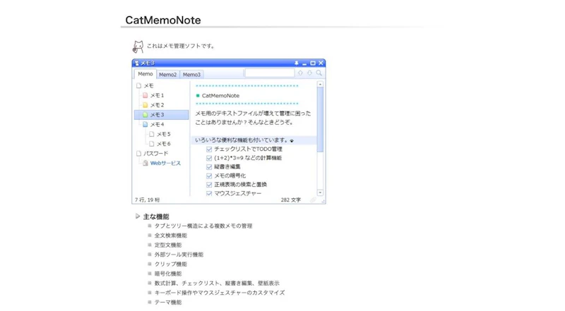 こちらは縦書き編集ができる高機能メモアプリ。「Cat」の名前の通り、全体的にかわいらしい印象。カスタムテーマの機能も付いています。ツリー管理ができるのでショートショートや短文エッセイの書き溜めなんかにもいいかもしれませんね。CatMemoNote