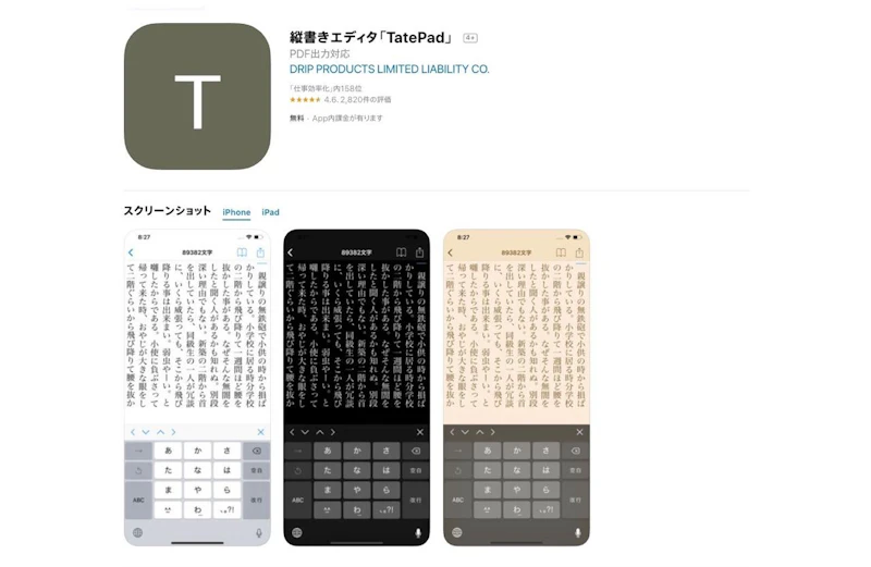 iPhoneアプリで縦書きエディタといえば、真っ先に名前があがるのがこれ。メモアプリ感覚で手軽に使えるので、気が向いたらサッと起動して文章を書き始めることが可能です。文字数カウントが上部に表示されるのが意外と便利。スマホの画面だと文章ボリュームが把握しづらいですからね。TatePad