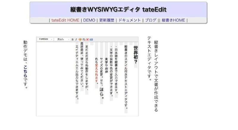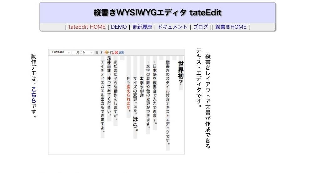 ウェブブラウザで動作する世界初(?)のオンライン縦書きエディタがこちら。WYSIWYGエディタでもあるので、太字や文字色変更といった装飾も可能。データはHTMLで出力できます。現在はデモ版が試せるもよう。今後はこういったオンラインエディタが増えてくるのかもしれませんね。tateEdit
