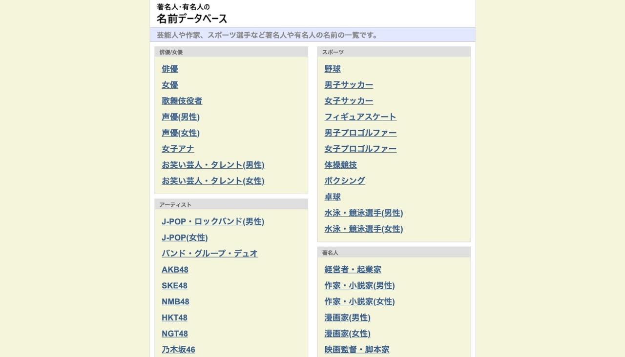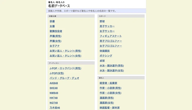 芸能人やスポーツ選手等の名前が集められたサイト。漢字と読みが両方載っているので、一部を拝借しやすいかも。著名人・有名人の名前データベース