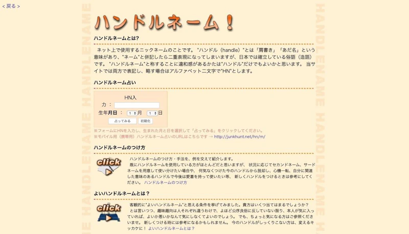 ハンドルネームと生年月日から占ってくれるサイト。占い結果には「改名案」まで提案してくれてます。※ちなみに「折川はつせ」は凶(不条理な仕打ちや、解決困難な壁にぶち当たり、不運が不運を呼び、悪循環に陥ります。)ぎゃふん。ハンドルネーム!