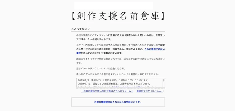 様々な名前がまとめられたデータベース。人名だけでなく動物や植物の名前なども載っているので、ピンとくるキーワードがきっと1つは見つかるはずです。創作支援名前倉庫