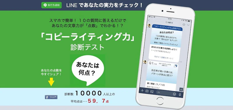 10個の質問に答えるだけで、コピーライティングスキルを診断してくれるというLINEを活用したサービス。