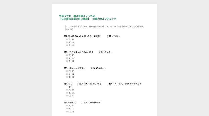 「手話で行う日本語講座」という通信講座を行っているサイトの日本語力テストページ。