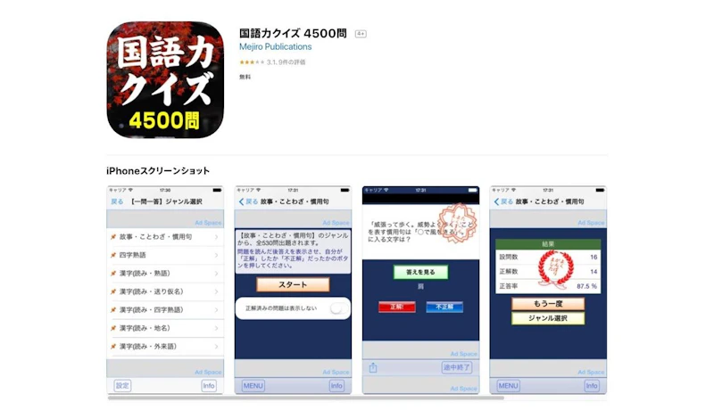 漢字の読み書きや、ことわざ・慣用句、文学や古語など、様々な国語スキルをクイズ形式でテストできる無料アプリ。